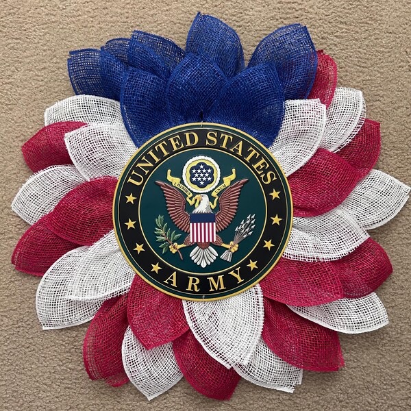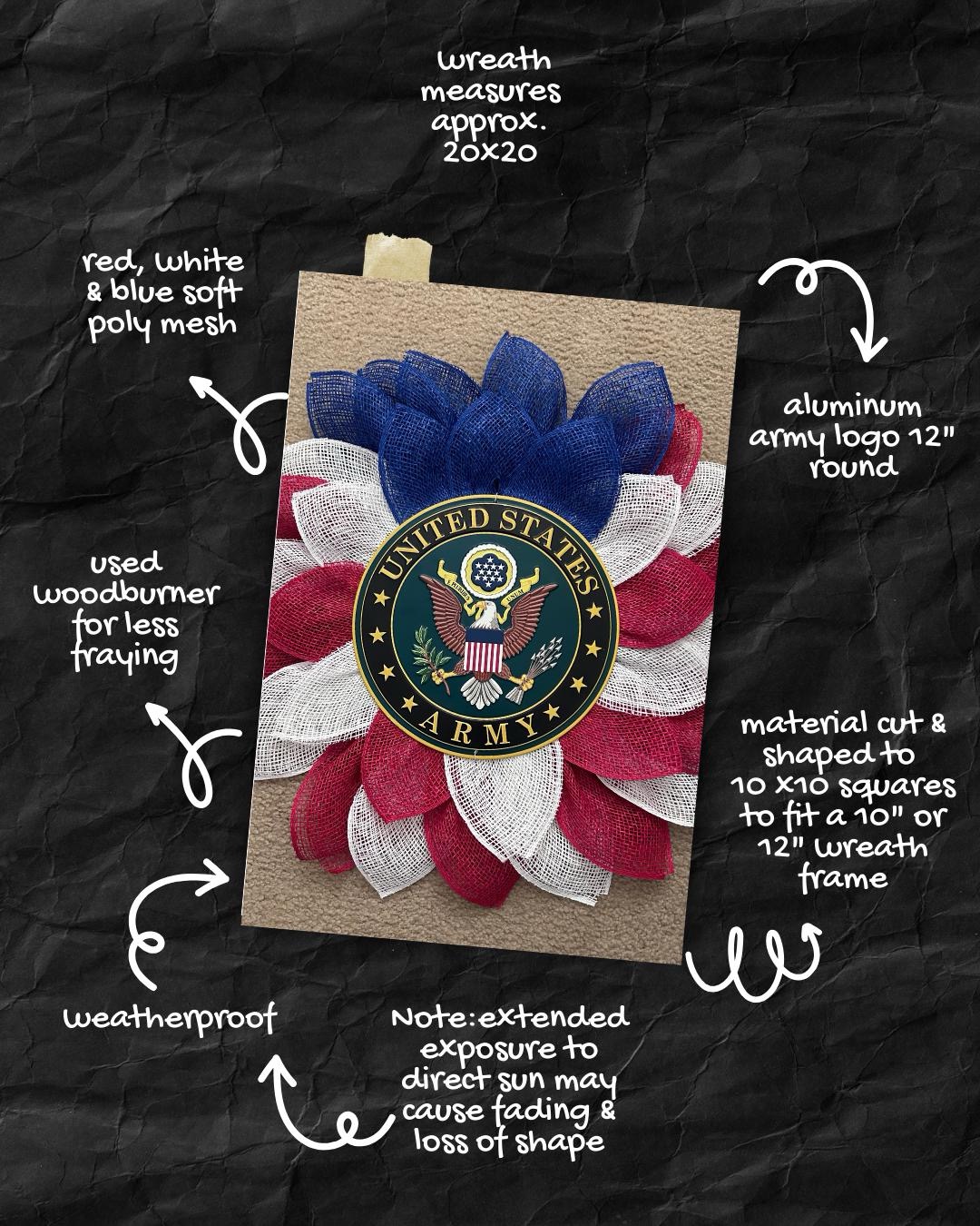 This red, white, and blue Army wreath is a striking tribute to the courage and commitment of our soldiers. Layers of vibrant mesh in patriotic colors create a full, dimensional base, while coordinating ribbons add movement and texture. At the center, an Army emblem or star accent stands proudly, symbolizing honor, duty, and unwavering service. Touches of gold, camouflage, or metallic details can be added to echo the strength of the U.S. Army.