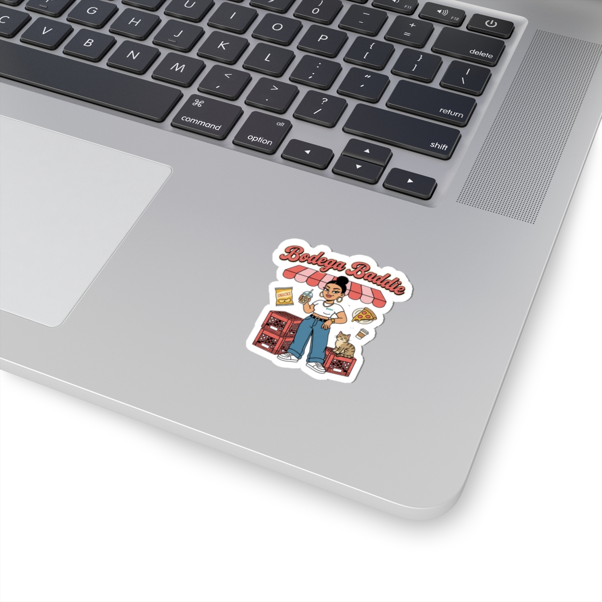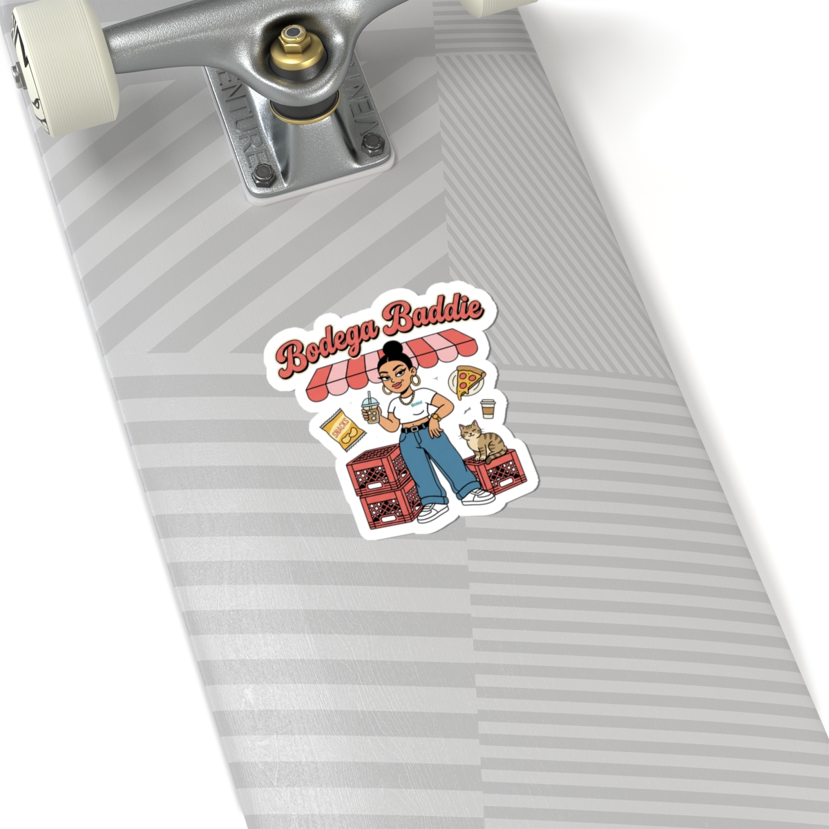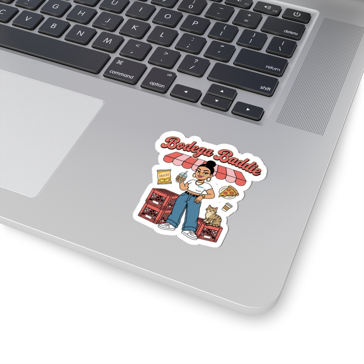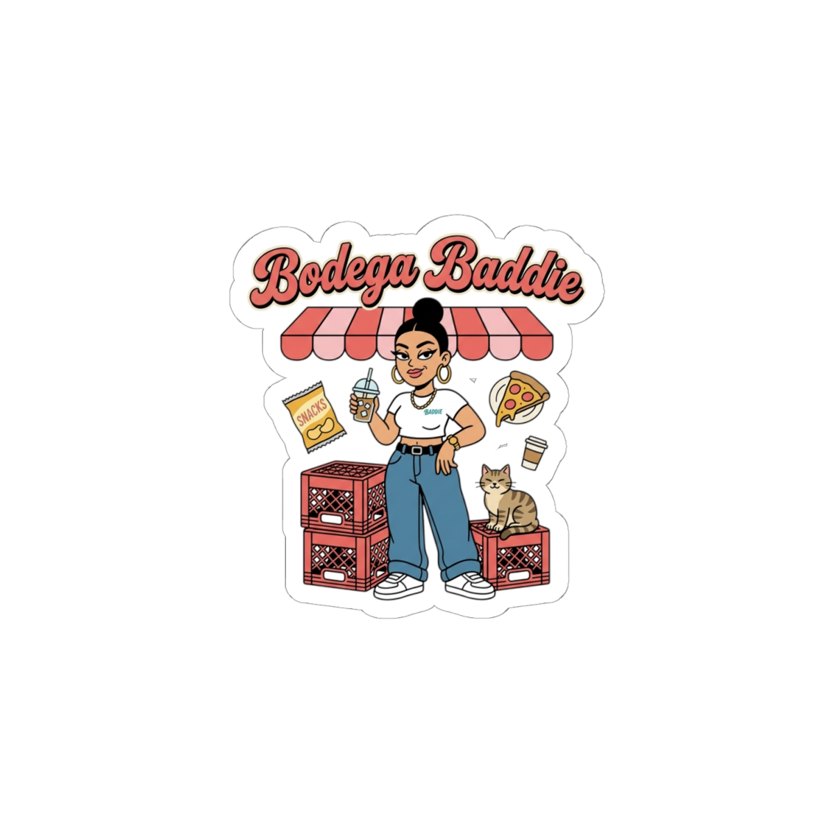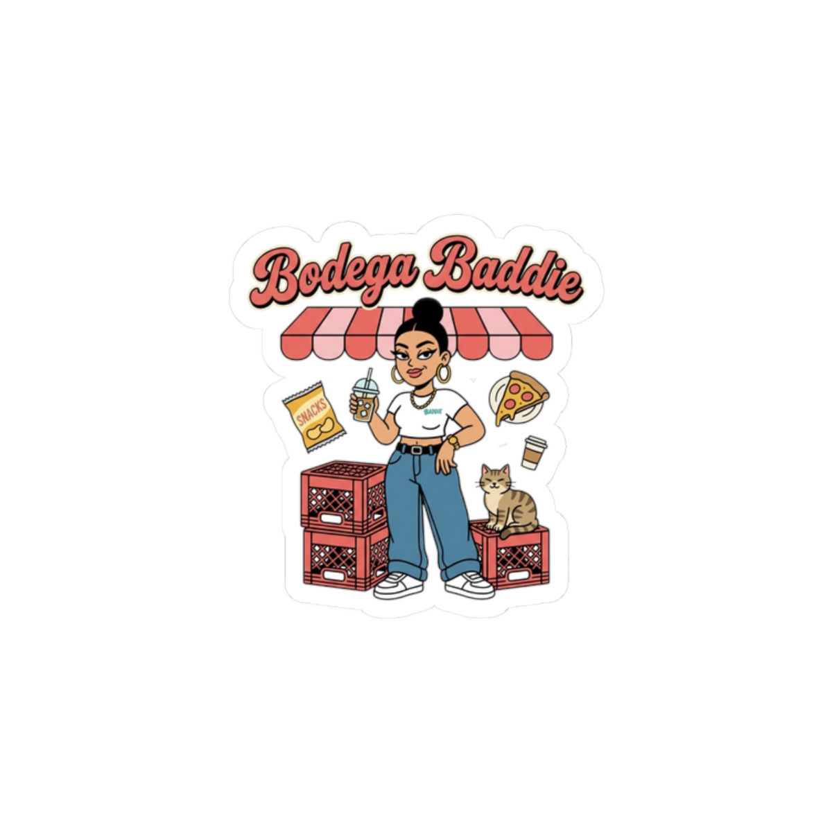 A cheeky, NYC-inspired kiss-cut sticker showcasing a confident corner-store character surrounded by deli snacks, milk crates, and a lounging cat — all in soft reds, creams, and Y2K-influenced lettering. The illustration channels bodega energy and Spanglish attitude with varsity-style type and playful neighborhood details, made to personalize laptops, journals, and windows for a streetwise, nostalgic look.