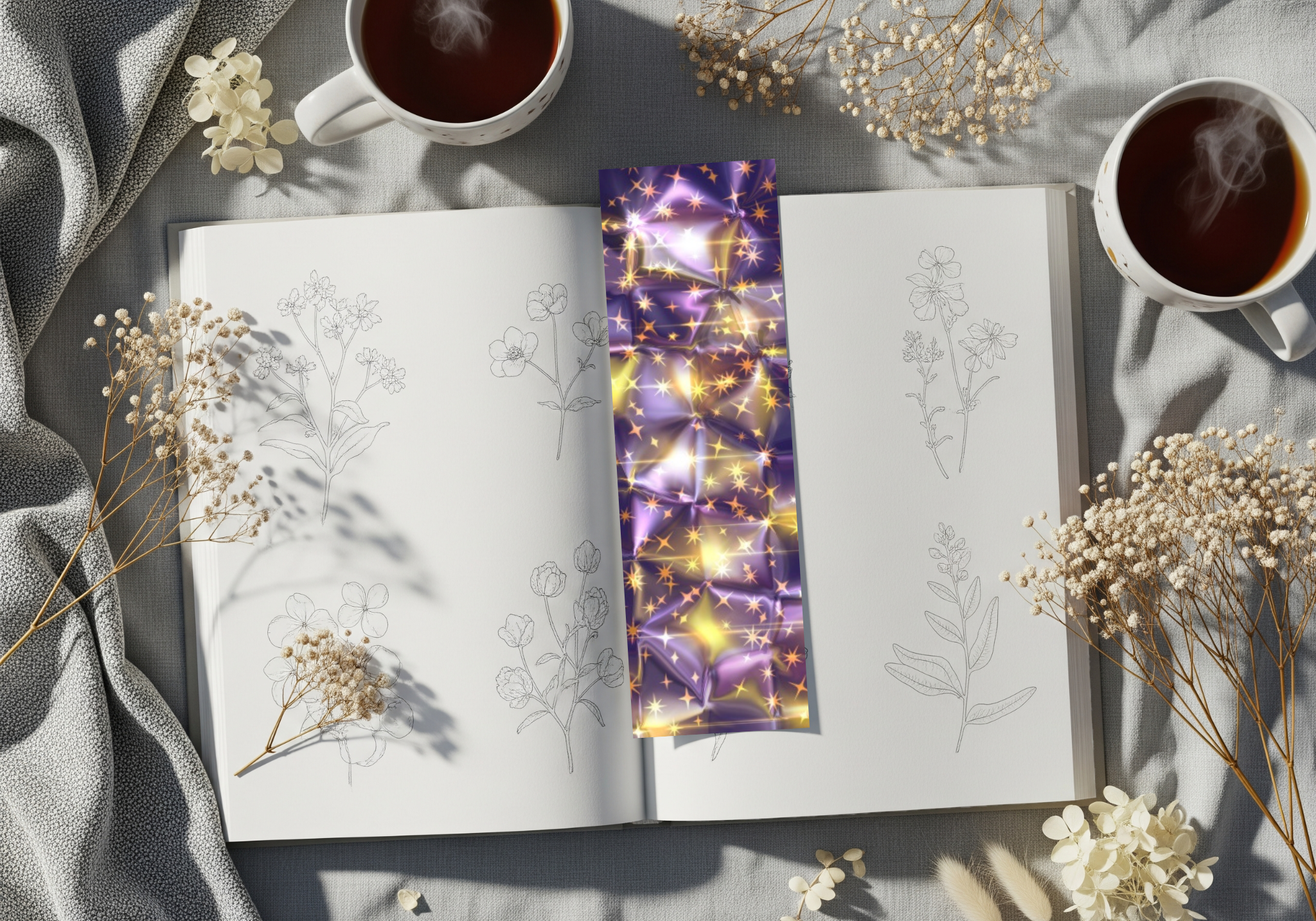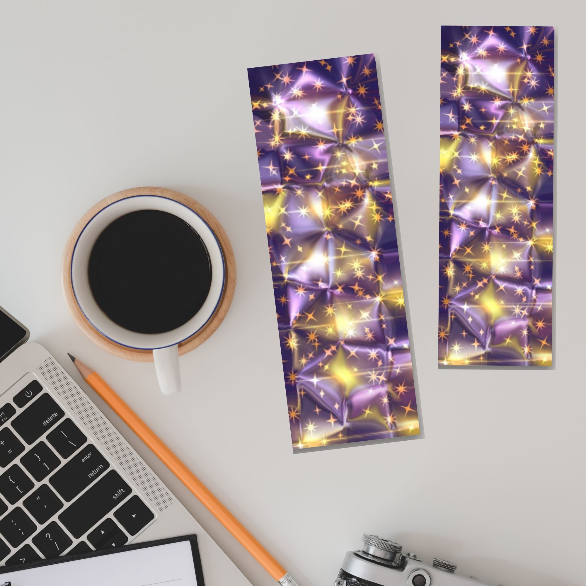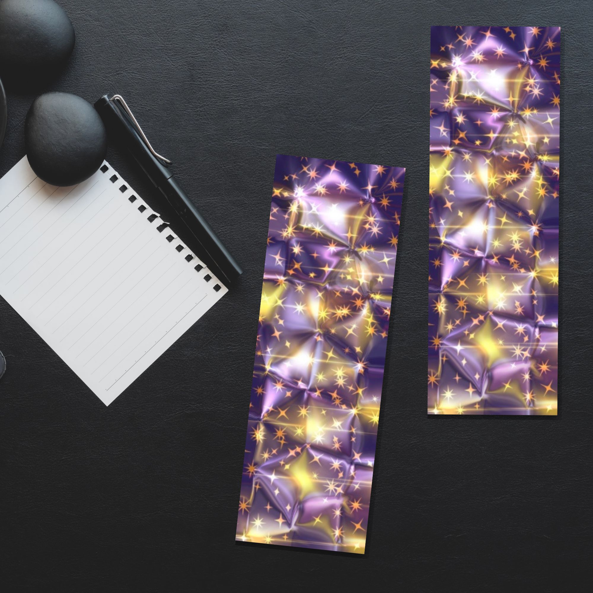 The Golden Purple Galaxy bookmark captures the magic of a night sky painted in cosmic gold and deep violet. Swirling stardust, glowing nebula tones, and shimmering celestial accents create a design that feels both mysterious and luminous — like holding a tiny universe between the pages of your favorite book.