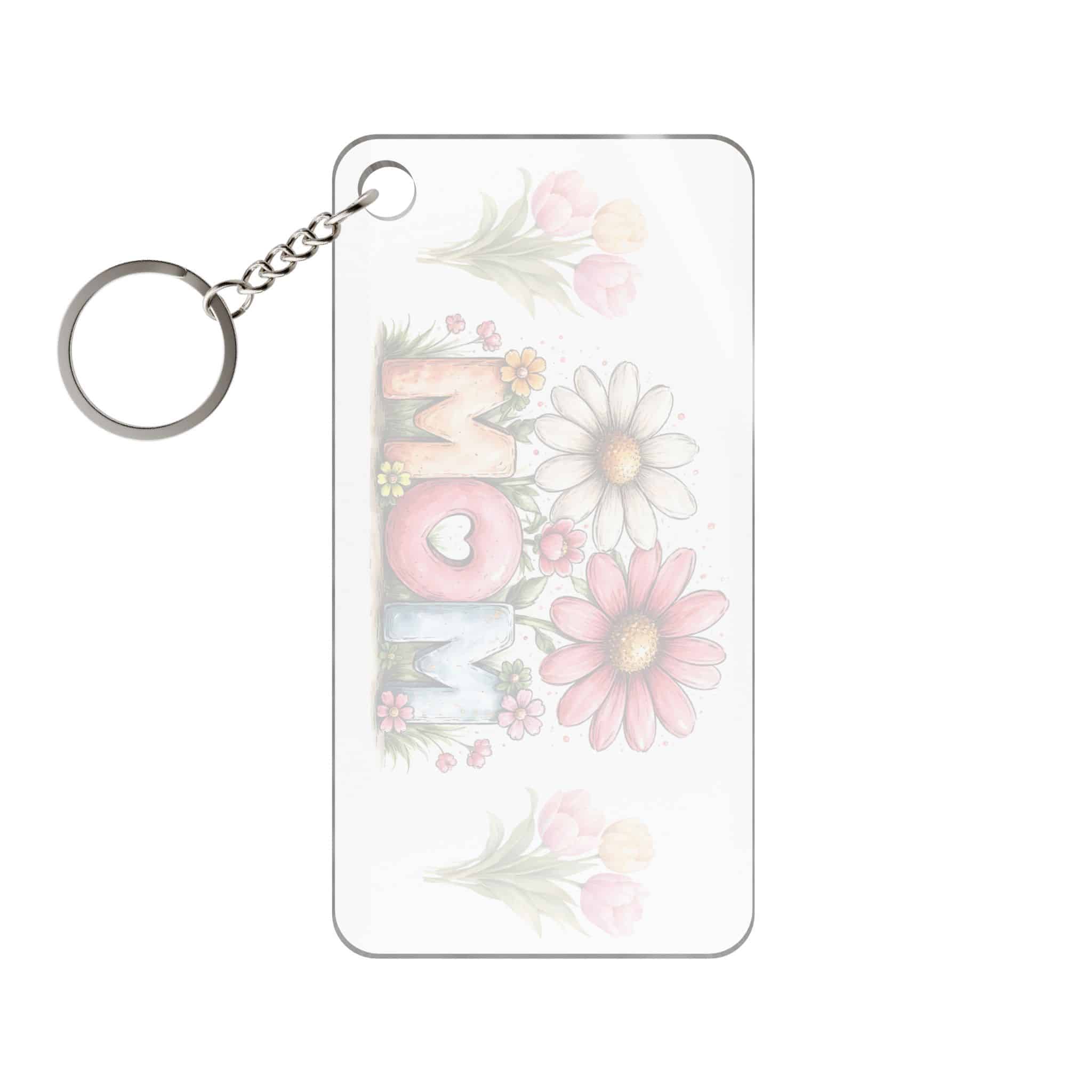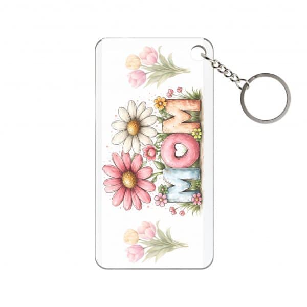 A bright, heartwarming acrylic keychain charm that carries a soft, hand-painted floral ‘MOM’ design. Lightweight and clear, the charm lets the colorful daisies and pastel tulips float above your keys or bag, bringing a gentle, cheerful touch to everyday moments. It feels like a small handwritten note from someone who cares — the watercolor textures and muted colors make it quietly sentimental. This charm slides easily onto a keyring or zipper pull and keeps the artwork visible from both sides thanks to the transparent acrylic. It’s the kind of little object that sparks a smile whenever a mother reaches for her keys or tucks it into a purse.